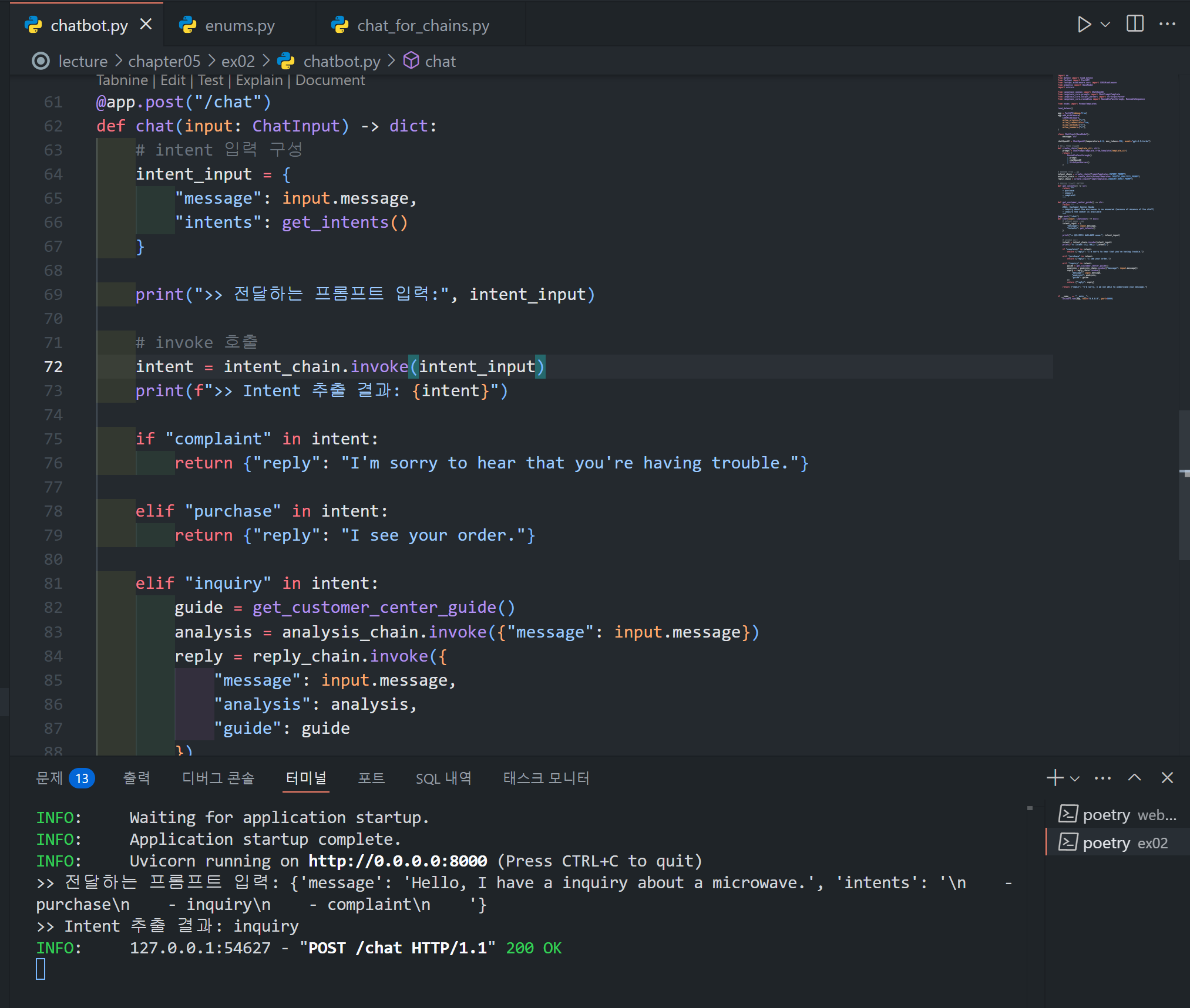 본 포스팅은 패스트캠퍼스 환급 챌린지 참여를 위해 작성하였습니다. 어제에 이어서 LLM 프레임워크에 대한 이해 중 LangChain의 이해와 실습을 해 봅니다.LangChain 실습 오늘 실습은 LangChain 기반의 LLM 서비스 구현 과정을 처음부터 끝까지 직접 따라가며 구성해보는 매우 밀도 높은 학습 시간이었습니다. 단순히 텍스트 생성 모델을 호출하는 수준을 넘어서, 의도 분류(intent classification), 질의 분석(inquiry analysis), 답변 생성(reply generation), 벡터 검색 기반 문서 검색(RAG)까지 실제 서비스에서 필요한 흐름을 단계적으로 구현해보았습니다. 이 과정에서 FastAPI를 백엔드 서버로 사용하여 HTTP 기반의 API로 LLM 체인..